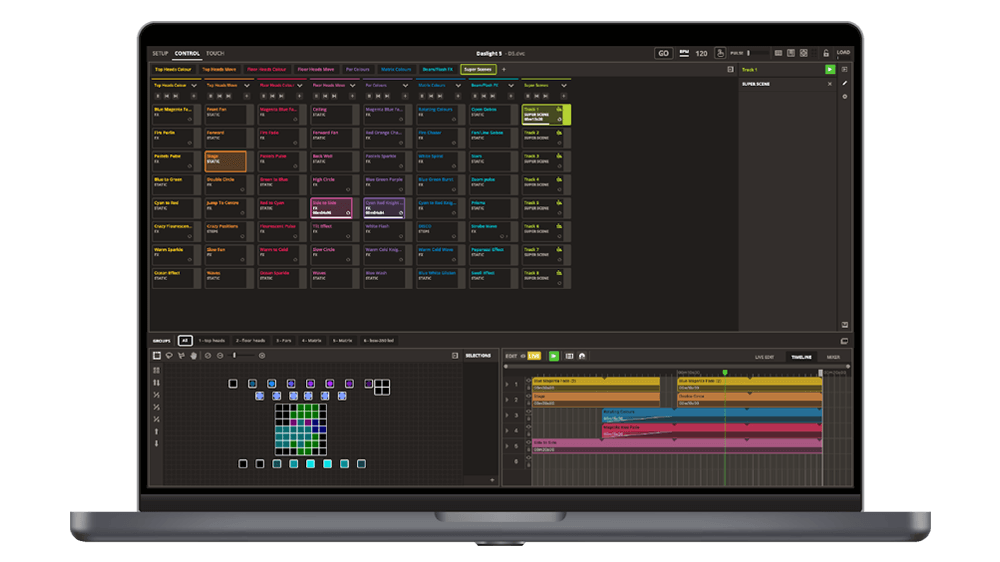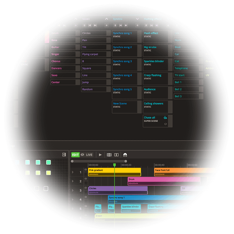 Daslight Virtual Controlerは、フランスのNicolaudie社が開発したDMXライティングコントロールソフトウェアとUSB-DMXインターフェースのパッケージです。このソフトウェアは、PC画面上で直感的に操作でき、複雑なプログラムも容易に作成可能。さまざまな照明機器を制御できるだけでなく、USB-DMXインターフェースにはメモリを内蔵しており、PCで作成したシーンをメモリに書き込むことにより、スタンドアロンで使用することもできます。照明デザイナーのために開発されたこのパッケージは、ライブイベント、舞台演出、建築照明など、あらゆるシーンで活躍します。