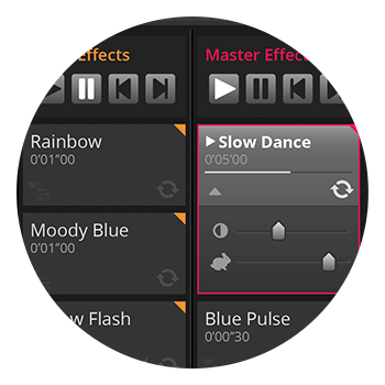 新しくなったショーモードにより、画面を細かくカスタマイズすることができます。パン/チルト・グリッド、カラーホイール、ボタン、フェーダーを追加し、レイアウトとカラーを選択してお好みのコントローラーを作ることができます。同じコントロールに対して異なる調整範囲をアサインしてサブマスターとグループコントロールを作ることも可能。