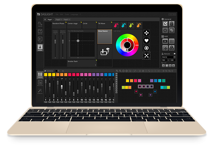Daslight4はディスプレイを無駄なく隅々まで利用します。ウィンドウを動かしたり、スクロールしたりすることなく1920×1200ピクセルの画面に150以上のシーンを再生することが可能。新しくなったライブツールボックスでは、タッチスクリーンを使用してライブエディットを実行したり、シーンを移行したりすることができます。