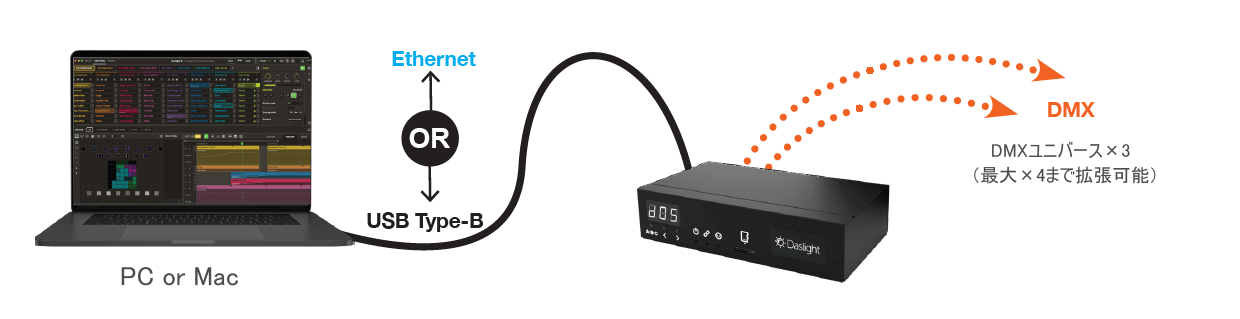 インターフェイスをソフトウェアに接続すると、インターフェイスから、直接DMX信号を出力し、ディスプレイには[USB/ETH」続いて「PC/nAC」と表示されます。